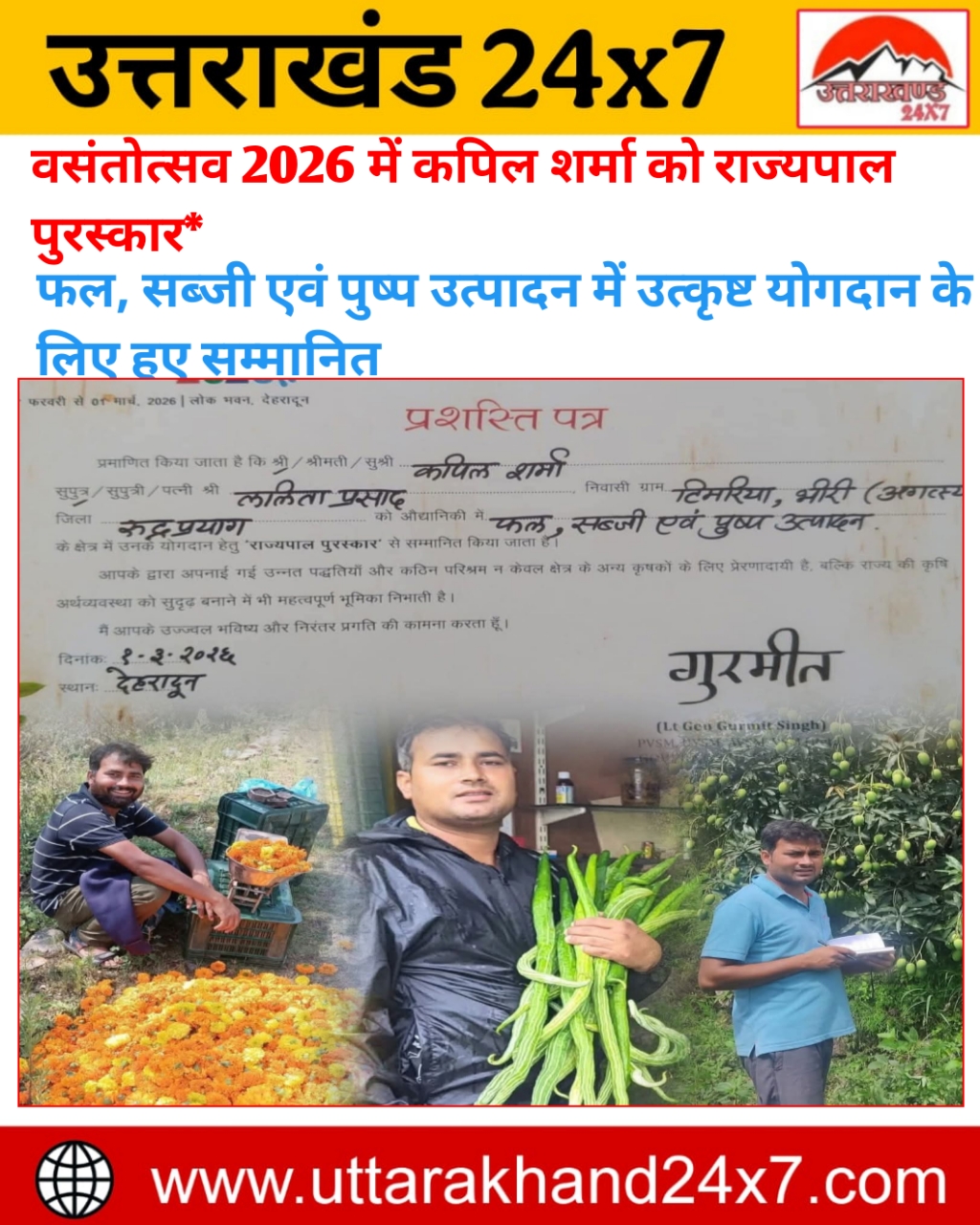 देहरादून स्थित लोक भवन में आयोजित ‘वसंतोत्सव 2026 – फ्लोरल हीलिंग: नेचर्स पाथ टू वेलबीइंग’ कार्यक्रम के दौरान रुद्रप्रयाग जिले के ग्राम टिमरिया, (अगस्त्यमुनि) निवासी प्रगतिशील कृषक कपिल शर्मा को फल, सब्जी एवं पुष्प उत्पादन के क्षेत्र में उल्लेखनीय कार्य के लिए राज्यपाल पुरस्कार से सम्मानित किया गया। उन्हें राज्यपाल